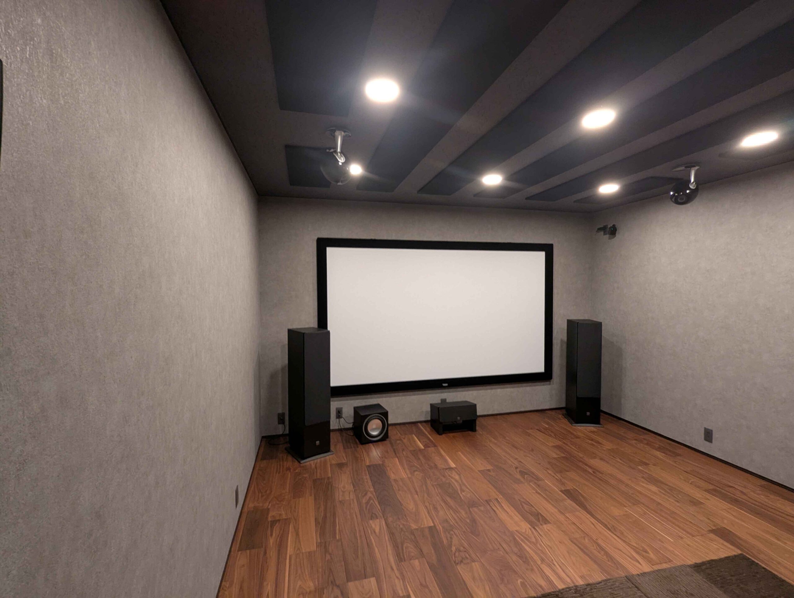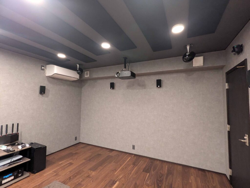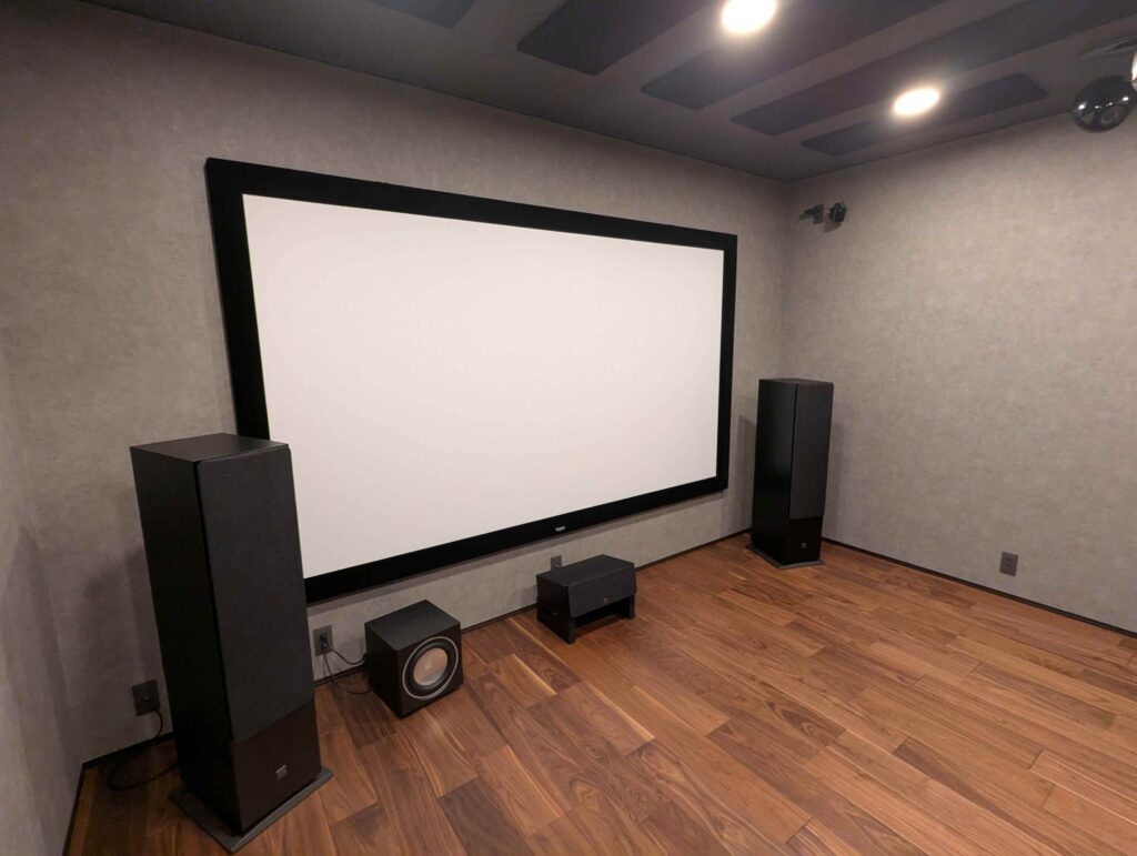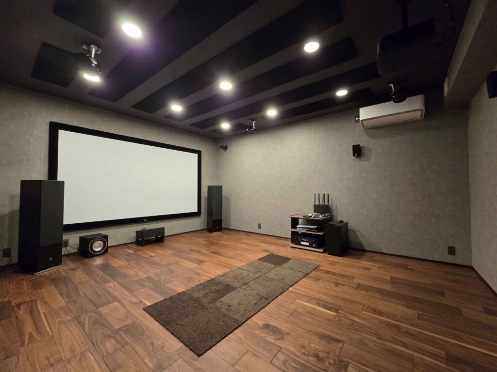 7.1.4ch120インチ防音室シアター 2025年10月25日 kato こんにちは。ホームシアター工房名古屋の加藤です。 今回は防音室シアターのご紹介です。 120インチのパネルスクリーンと7.1.4chの本格シアターとなっております。 防音室は㈱リブテック様施工です。